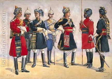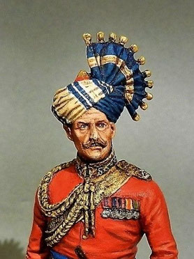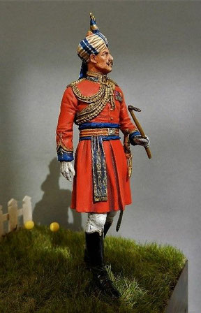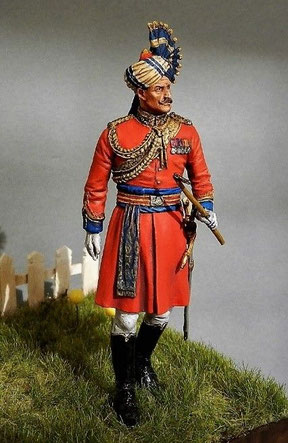 Dans le cas des régiments indiens, que leur propriétaires soient britanniques ou des princes indiens, ils appartiennent à ce qu’on appelle le Raj . Les officiers sont britanniques mais les régiments ont souvent un commandant honoraire indigène ( Honorary Native Commandant) du rang de Maharadjah (Grand Roi en sanscrit )ou Nawab (mot d’origine ourdou, appelé souvent Nabab).