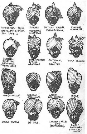 En tenue indienne le turban , ou lungi est porté. C’est une longue étoffe de soie ou coton enroulée autour d’un bonnet pointu, le Kulla. Les sikhs le remplacent par un bonnet rond de couleur vive appelé pug ( prononcer pag) dont le bord inférieur dépasse sur le front. Le lungi est en général uni d’un côté et rayé de l’autre. L’ordre, l’épaisseur et les couleurs des rayures varient sans cesse et sont un véritable casse tête à identifier. De plus, si les britanniques ont tendance à le nouer avec la partie rayée de façon apparente sur le côté droit de la tête, les sikhs, rajputs et jats ont leur façon bien à eux mais différentes. Ce qui n’implique nullement la moindre uniformité. Le lungi se termine à une extrêmité par une crête émergeante ou pendante, du côté droit ou gauche, selon… l’autre extrêmité pend derrière la tête, le palloo, jusqu’au milieu du dos. Le pallo peut montrer à l’extérieur les mêmes rayures que le lungi, sans obligation