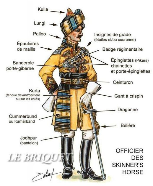 Je ne traiterai dans cet article que de la tenue indienne de ces trois officiers en particulier. La richesse et la diversité des quelques trente régiments de cavalerie empêche , ici, une étude plus approfondie, d’autant plus que même à l’intérieur d’un même régiment les tenues peuvent être complètement différentes. Quoiqu’il en soit, on peut malgré tout dégager un certain nombre de points communs.
