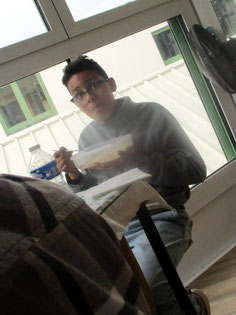 Alors que certains sortent leurs victuailles sur leurs postes de travail, Camille, Henri, Warren et moi-même, nous nous installons dans la véranda.....certes, un coin de table, mais à l'aise !!!